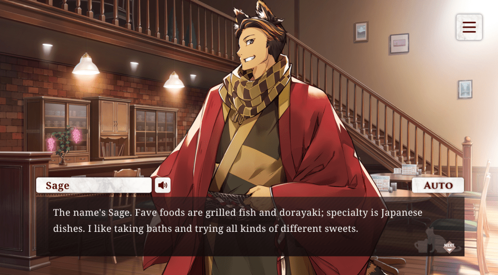 I love Sage! I loooove this catboy’s positive attitude and cheerfulness. I am just enamored with his happy-go-lucky outlook on life, and I find it super endearing how he likes to dote on you and loves getting petted every time he does something good. His route was by far my most favorite out of everyone, and I thought it was the only route closest to having an actual ‘plot’. 🤣 Sage’s story was also the only route that made me grin from ear to ear the whole time! 🧡