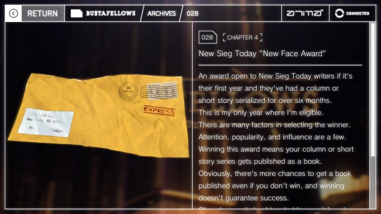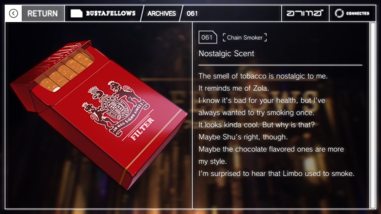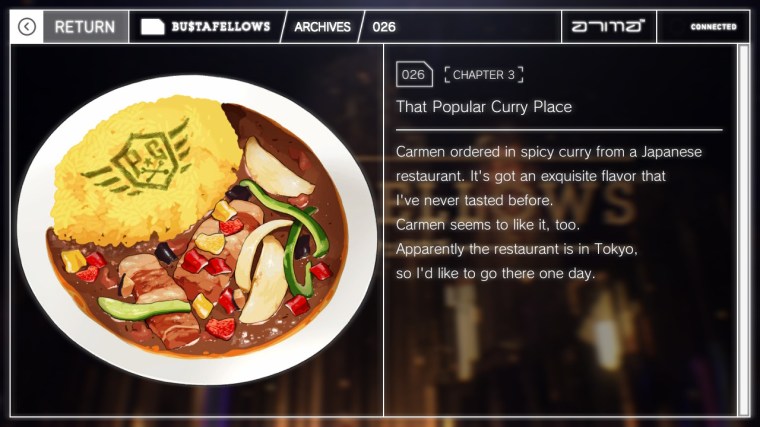 One of the pros I really loved about BUSTAFELLOWS’ system was the game’s EXTRA content. There were tons of unlockable short stories to enjoy, and a couple of them involved cooking food! Really now, who doesn’t like that?!🤤 Most of them included dainty food pics too, which was quite a treat!😁(Pun indented). I liked that the “Archive” section of the game was laid out to be very diary-esque, and was narrated from Teuta’s perspective. Moreover, I thought it was really smart to use Anima (Scarecrow’s AI) as the game’s main UI. It’s very stylish and surely fits the game’s modern theme.