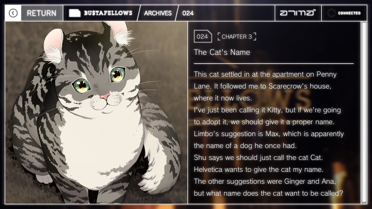 - First is the cat’s name. In chapter 3, each LI will suggest a cat’s name, and whichever name Bustafellows‘ resident cat responds to is the LI route you’re heading to.