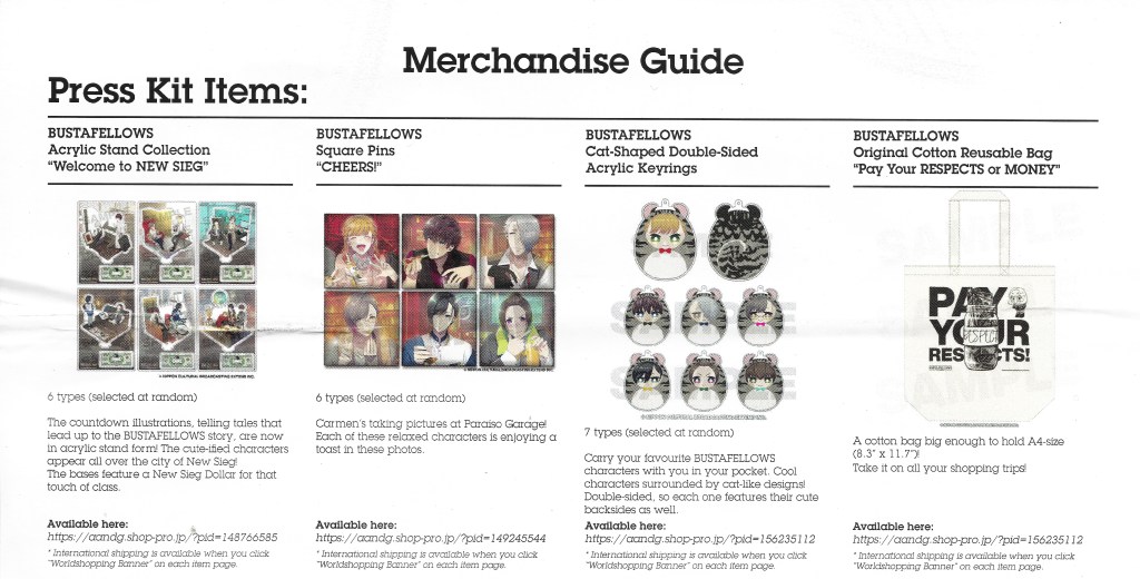For more cool BUSTAFELLOWS goodies, you can visit the online store A & G shop. This online shop ships internationally, which is a godsend for overseas fans. Keep in mind that other online Japanese shops like Animate JP, Stellaworth, Alicenet, Surugaya, etc. you will need a proxy service to get them to ship internationally.