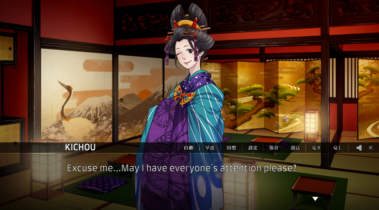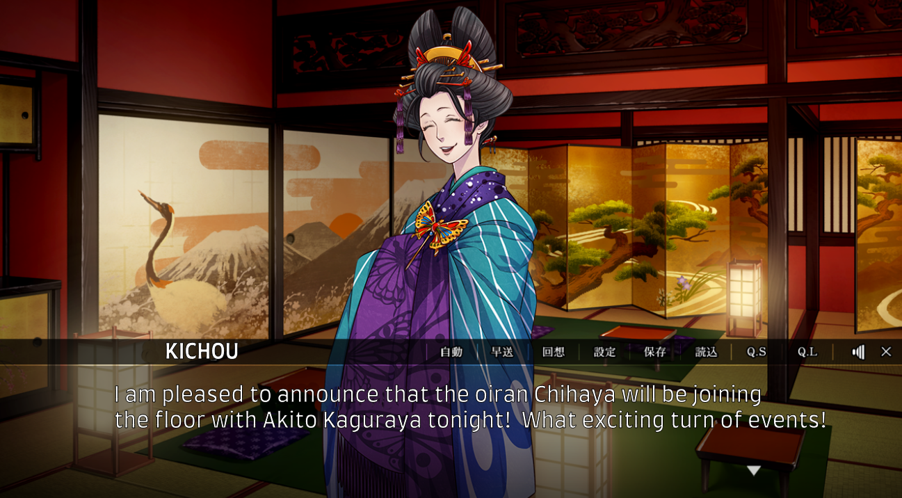What’s really nice about this game is that it imparts to the player the very detailed and intricate life of an oiran and the routine they go through each day. Whether or not it’s reminiscent of what actual oirans and tayus do back in the Edo period, it was all very interesting, so to speak. My favorite part was the proceedings of meeting an oiran, where a wealthy customer would need to go to a 遣手 “yarite”, a person-in-charge of the brothel, and arrange to meet with the oiran of that establishment. These had to be done three times to get the oiran’s service. On their first meeting, the customer would sit far away from the oiran. The oiran will not talk, eat or drink anything while the customer will have to display his wealth to her by ordering an abundance of food and sake as well as pay for the maikos and geishas to perform for that night’s entertainment. At the end of the first night, sake cups are given to the client and oiran. If the oiran puts the sake cup in her mouth, it means she’s accepted the client to continue seeing her, and if she rejects the cup, it means the client will no longer be allowed to come back the second time. (This practice is demonstrated in the common route, with Iseya). The second meeting is basically the same as the first, except the oiran will sit close to the client. Once the customer moves to their third meeting stage with the oiran, he becomes a 馴染み “najimi” (familiar client), earning the privilege to talk to the oiran and get intimate with her if he wants.