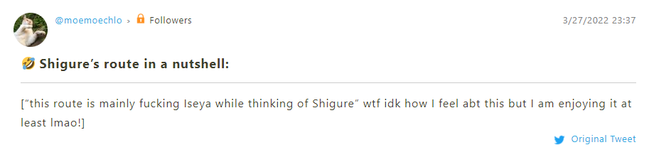 ***I made a mistake by playing Iseya’s route before Shigure’s, and I thought I was going crazy since all I’ve been unlocking are his bad endings no matter what (laughs) – that’s when I realized that you actually have to finish everyone else’s route first before you can obtain his happy ending.😩 So it’s probably best to leave Iseya for last to avoid some unwarranted frustration. ¯\_(ツ)_/¯