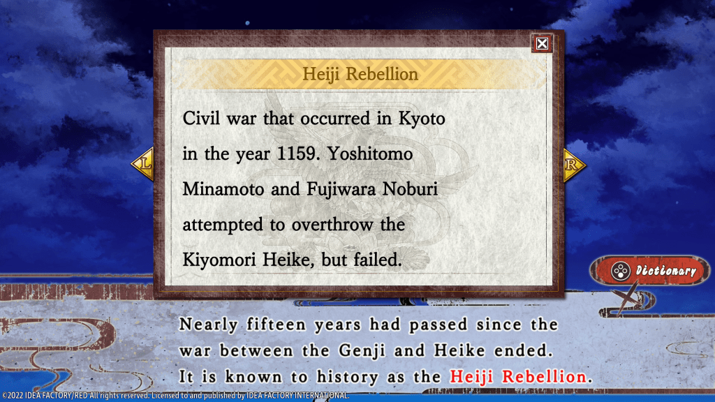 - The Dictionary is where players can view explanations of the historical terms used throughout the story.