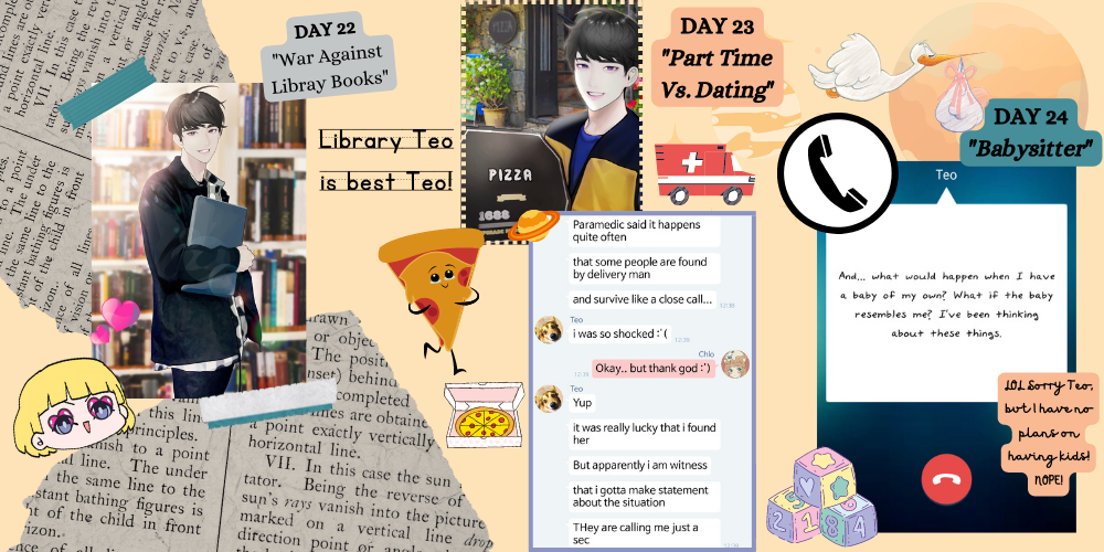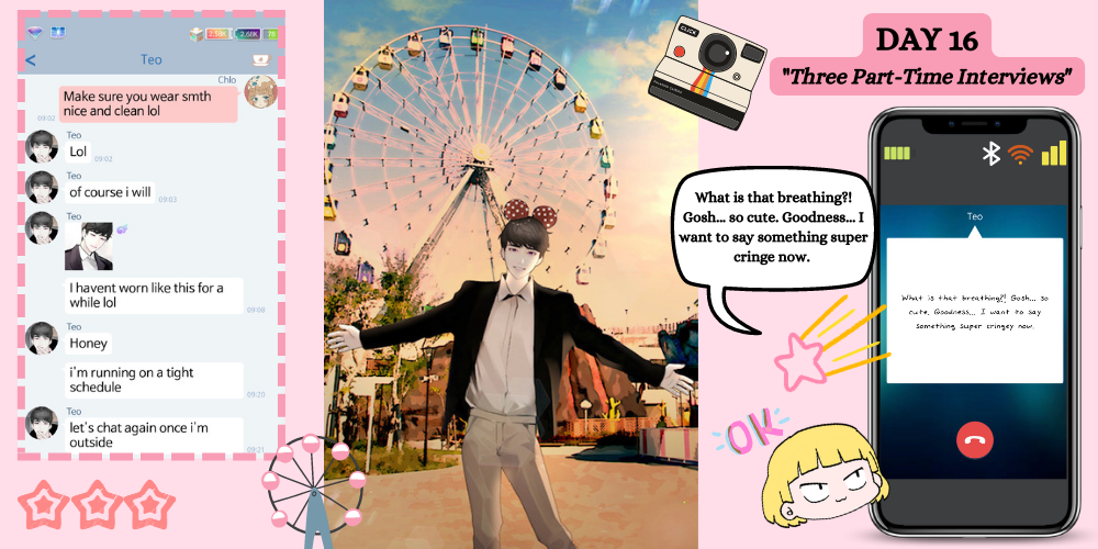 Comments: These are all boring events in Teo’s day-to-day life. He tells you that he takes these part-time jobs because he didn’t want to rely on his parents, and I’m honestly happy that he has this kind of mindset as it mirrors my own. I believe I took part-time gigs one after another since I was 18 (while juggling w/ school at the same time), and it wasn’t until I was 21 that I finally landed a full-time job, barely making minimum wage! 😂 ha! (you gotta start somewhere, ya know!) The phone calls here were especially fun. While Teo was part-timing in the grocery mart, he always spends his break times calling you. He also sings you the happy mart song during a phone call on Day 16. Teo also tried to be a little flirty on the chats, which is cute and all, but it wasn’t anything to hold your breath for.