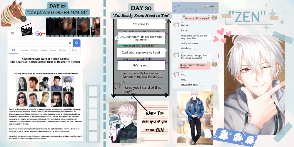 Comments: I love these days! Not only do we get a mention of Harry Choi on Day 29, but we get cameo pics of ZEN on Day 30. It is now clear that The Ssum’s universe is pretty much the same universe as Mystic Messenger, and I can’t wait to actually see more cameos of the MM characters. But I’m also hoping that they won’t take over The Ssum’s subplots too much, as I wanted this to be a separate game on its own. Anyway, I’ll expound on this soon when I get to part three of this Review Diary which will be more on Planet Mewry.