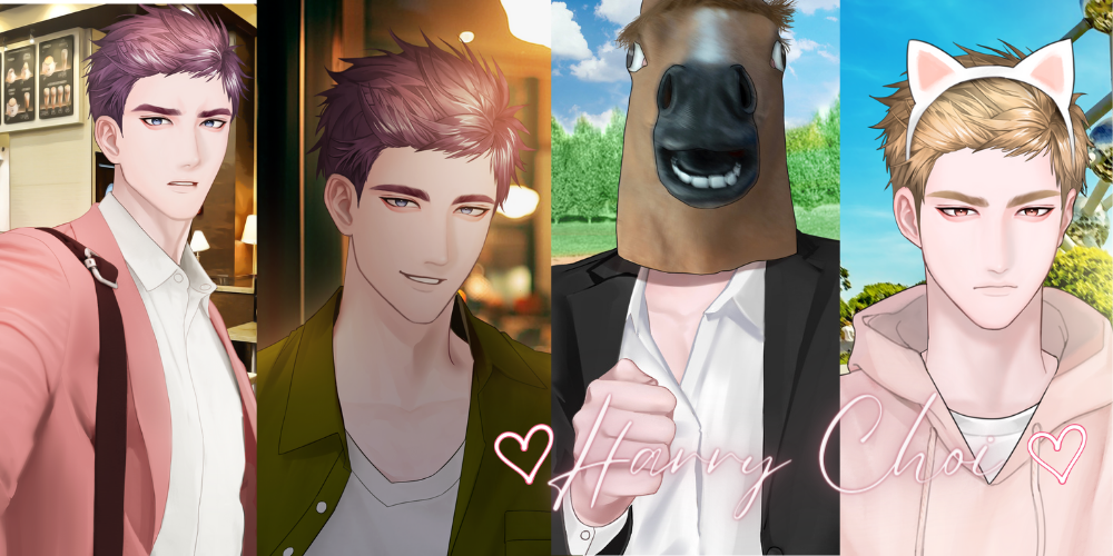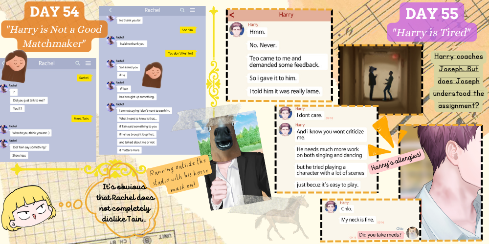 DAY 55: Today Harry is on another early morning shoot for MoM. He chats with you saying he’s getting coffee for the other staff/judges (as a courtesy, wow!). While the other staff members approach him, Piu Piu turns on voice-to-text, so you can hear what’s currently happening. Harry chit-chats with the MoM staff all cordial and pleasant, and they compliment him on how his mane is so shiny today. (cackles)..🤣 Harry plays along, until they ask him, who he talks to all the time on his phone. (GASP!!) he then answers “I should ask first if it’s okay to tell you”. And now all the staff members are intrigued! He then continues and says ‘he can’t tell them who this person is’, and just laughs it off like it’s nothing. Lunchtime and the shoot finally begins! Piu Piu tells you that the judges are evaluating the participants, and they were quite harsh, especially Harry! He also adds that Teo just finished his performance and that he looks good!^_^ The first judge tells Teo that his singing and dancing finally reached “OK” level and the second judge chimes in saying she loves Teo’s acting. Now it’s Harry’s turn to evaluate Teo and he….. bolts out of his seat abruptly and runs to his waiting room. Everyone was left stunned. 😱 After shutting the door behind him, Harry chats with you saying something’s wrong with the makeup he’s wearing inside the horse mask. He takes off the mask and snaps a close-up pic of his neck profile. You find out Harry is having some sort of allergy from the mask. He tells you he wants to go home but Piu Piu reminds him that the shooting is not over yet and violating his schedule with no legitimate reason could only result in extra required participation. Harry doesn’t like to shoot any more extra scenes so he decides to stay and continue for the day. He calls you after this chat and tells you not to worry about his allergies, and that Big Guy is now on his way to Harry with a new horse mask! (lol yay Big Guy to the rescue!!) Later at night, Harry chats with you and tells you his neck is fine, and that it was just an allergic reaction to the previous mask he wore. Piu Piu interrupts the chat and tells Harry that he should not have ranted to Teo like that. Apparently, after Harry got back on set, Teo walked up to him and demanded some feedback, and he told him he was ‘lame’ (lol wow such a meanie!) You told him being honest is one thing, but he needs to realize that people will criticize him for this. Harry replies that he doesn’t care. And says he’s fine being criticized by others as long as it’s not you. He also explains that Teo took a role that had so many scenes which didn’t mesh well with his ability to sing, act, and dance. (He’s talking about the DraKola scenes in Teo’s route). He leaves the chatroom saying “there’s something he needs to do.” Come bedtime chat, and Harry tells you he came to see Teo and tried to ‘correct’ his evaluation of him from earlier. He also mentions that Teo says he needs to do his best because someone is watching him, and there was an option in the choices for MC to say “Is he talking about me?” (I accidentally picked this option, and Harry’s response seemed a bit irritated! T_T uhuhu!) The call after this chat is where Harry explains that he showed Teo “footage” about what he’s trying to tell him from earlier. His explanation here was kind of vague but if you’ve played Teo’s route, this was the day when Teo tells you that Harry came to see him and showed him a video of Teo holding the camera filming his colleagues looking all happy.