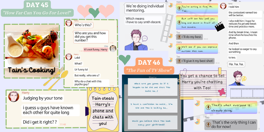 DAY 46: Third Day of MoM shoot and Harry arrives late in the set. Since he cant chat on the phone, Piu Piu relays to you what’s happening around him. Piu Piu says Joseph is staring at Harry all-eager ‘like a bird courting him’ (lolwhat). Piu Piu also mentions that Teo is there as well, and the man seems to be obsessed with his phone. Harry soon enters the chatroom and tells you he couldn’t find a perfect contestant among the participants. You ask him how Teo is doing and he tells you he’s not bad but he needs to practice more. During lunch chat, the MoM judges are asked to do individual mentoring, and Harry complains because that means he needs to say something decent lol.😂 He turns on the ‘i-can-see-ur-voice’ feature so you can hear what’s going on during his mentoring session. It was Teo’s turn and he tells him his acting is fine but he’s not sure how well he’ll be able to sing and dance live on camera. Teo responds that he’ll give it his best shot and Harry taunts him a little by saying they have to eliminate four out of forty today. There’s a call after this chat that’ll allow you to tell Harry that you’re the one Teo is talking to on his phone. I picked this option and Harry just replies with: “Haha. Sure”😂 (meaning he doesn’t beleive you). Later in the evening, Piu Piu tells you Teo made it in today’s round and Harry comments how Teo would always fidget with his phone. Harry also comments that the reason why Joseph was so eager for his attention is because he’s is jealous of Teo. Harry finds his new discovery intriguing, and tells you, he may be able to get them both eliminated. He later on coaches Joseph that the only way for Teo to improve is to practice more and reduce his break time, meaning the time he touches his phone! (OMG!!) Joseph gets the memo, and well, if you played Teo’s route, you know what happens here. Joseph thanks Harry before he runs off to their camp. Harry feels good that he’s instigating some type of conflict between the two, and you and Piu Piu tell him he’s evil for doing that.