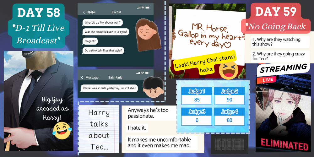 DAY 59: It’s the Muse of Musical Live Broadcast Day!! And holy cow! The way to the studio is pretty crowded as fans flock over to the broadcasting location. It looks like the show is really popular! Big Guy is driving Harry to the studio, and they decide to take a detour to get away from the crowd. Harry tells you he’ll drop at a nearby cafe, get some black tea and walk to the studio. Upon arriving at the cafe, Harry spots Teo getting interviewed. He immediately gets irritated by the fact that Teo is always in a positive mood. He tells you he can’t understand why the fans are going crazy over Teo when he doesn’t have the talent nor skills for this competition. You tell him it’s probably because Teo is perky and beaming with positivity, and he counter-argues your opinion saying “Teo is such a typical prototype of the nice-guy-syndrome.” He says seeing Teo being overly passionate makes him very uncomfortable and angry. There’s a call after breakfast chat where Harry tells you that he doesn’t want you calling him “Director Harry” because it makes him feel distant to you and he doesn’t want that as it’s only you who knows the ‘real’ him. (uhuhu Harry is getting sentimental, i cry!! 😭) Lunchtime and Piu Piu interrupts your chat convo with Harry, saying Teo is about to go on stage! Piu Piu sends a picture of Teo looking so good in front of live camera that even Harry is mesmerized and moved by Teo’s presence. During the call after this, you tell Harry that you get motivated yourself when you see someone like Teo doing his best, and he replies by saying that for a split second, he felt the same way when he saw Teo on stage glowing with positivity (oh-em-gee!).