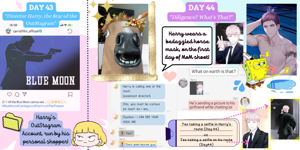 DAY 44: Today is Muse of Musical’s first day of shooting, and Harry wears a bedazzled horse mask (with gold ribbons and everything) prepared by his stylist lol. During breakfast chat, the contest has already started and Piu Piu tells you, he sees Teo among the contestants. The other judges interview Teo about being in the same University as Harry, and Teo just answers that they never particularly noticed each other. Harry just nods during these slew of interviews and doesn’t say a word. When it’s time to rate the contestants, Harry rates Teo an average of 5/10, and when the other judges ask why, he replies it’s due to Teo’s level of competence (omg..Harry you big meanie!😂). Lunchtime and Harry chats with you first, telling you he’s on break and in his waiting room. He also tells you that Teo’s performance was so-so, and complains that the MoM staff is talking to him too much. He takes off his horse mask and sends you a handsome selfie and a picture of his lunch. Come dinnertime, Harry tells you there was something wrong with the shooting equipment, so they had to take a break again. Suddenly Harry catches Teo taking a selfie in the dressing room (GASP!!) and wonders what he’s doing. You tell him that “he’s sending a picture to his girlfriend while chatting”. Harry pays no mind to your answer but then moves to approach a MoM staff. Piu Piu turns on the voice-to-text feature as he figures you’re probably curious about what’s going on atm. So Harry goes and tells the MoM staff that he’s quite concerned about the ‘pink-haired guy spending his personal time like that’ (referring to Teo taking a selfie earlier), and also adds that unreleased content may get leaked because of it. He convinces the staff that whatever Teo was doing was kind of troublesome. The MoM staff says he’s going to bring this up during the next staff meeting, and then he runs off. Piu Piu tells you that Harry has a mischievous smile on his face right now. (omg what a bully! lolol) During bedtime chat, Harry heads home and goes for a swim. He sends you a delicious half-naked pic of him by the pool all wet! (Hhnnngg!) You lowkey confronted him about purposely tattle-tailing on Teo earlier, and he admits that he’s having fun messing around with Teo because he works really hard and it’d be interesting to see him freak out once the staff mentions his phone. (sucha meanie!!) Anyway, he calls you by the end of this chat telling you goodnight while he’s in the pool. ❀Click to View Scrapbook❀