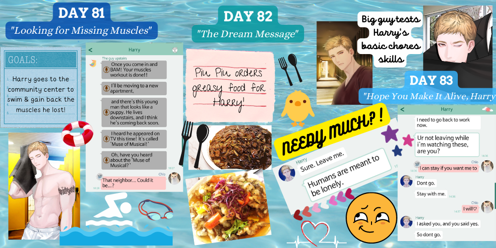 DAY 81: Piu Piu tells you today that Harry has lost a few muscles due to staying idle for a few days. He also mentions that he’s lacking the ‘usual’ exercise routine, he normally does. Harry decides he needs to work out and heads over to the community pool to go for a swim, (since the pool by his place is closed for cleaning). Harry arrives at a community center and realizes that there are more people there than he expected. At the pool, he meets a beefy lifeguard who tries to engage him in conversation and offers to train with him. The lifeguard also invites Harry to his gym, which he runs, but Harry declines. It is later revealed that the lifeguard is Teo’s neighbor. (if you played Teo’s route, he’s the guy that moved into the apartment above Teo’s, making all these construction noises that Teo complains about). Nothing too important really happens this day except for Harry sending you half nakie swimming pics and some ASMR calls of Harry munching his food. lol