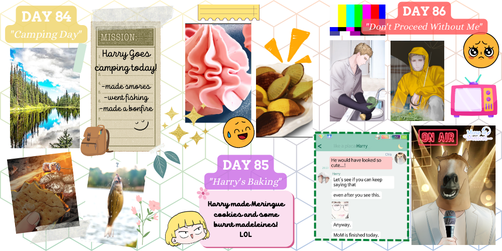 DAY 85: Early morning you get a gift from Piu Piu which is dun dun dun A HARRY FEET PIC!! (Istg this game is riddled with feet pics!!) Today, Harry tries baking and makes meringue cookies and madeleines, which he shares with Big Guy. It’s raining heavily outside as well, so he rushes to protect the vegetables in his garden from the weather.