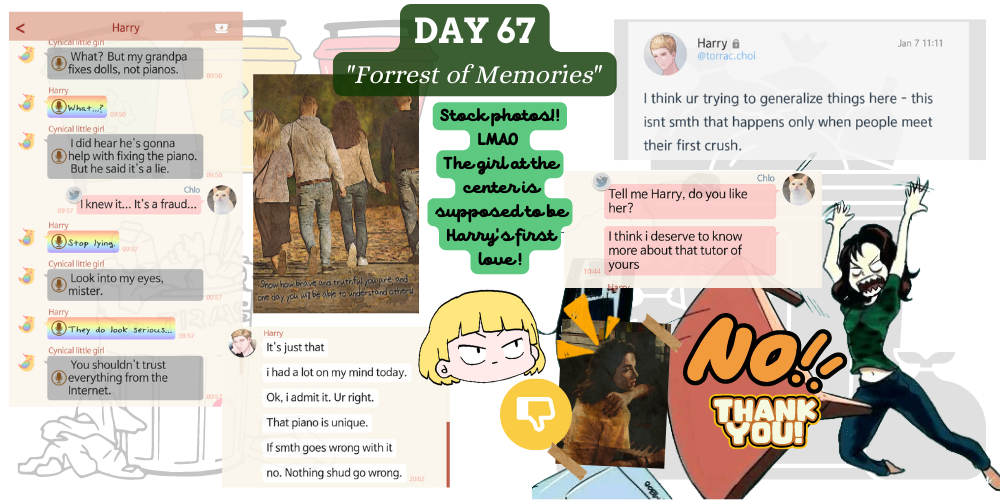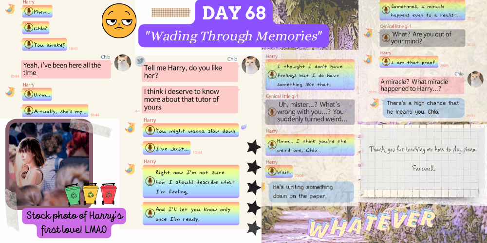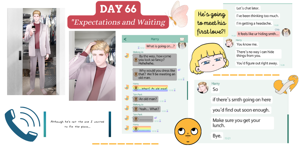 DAY 82: Harry wakes up from a nightmare. He says a fluffy furball came in and wrecked his place. Later in the day, he orders food, but since the elevator in his building is out of order, he needs to pick up the food delivery downstairs. He steps out and bumps into his neighbor (an old lady that doesn’t like Harry). The lady scowls at him with a bunch complaints starting from his garden upstairs, dripping water from his terrace, and how he cant segregate his trash properly. During nighttime, he tells you that his lunch was ruined because the food (which Piu Piu ordered for him) was greasy af and he couldn’t eat it, so he ends up tossing it in the trash bin. He also mentions that Piu Piu messed with his phone and ended up calling Teo by accident. Teo textes him as a result, asking him a couple of times why he called.