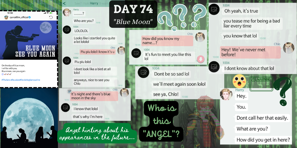 Today, Harry goes to Blue Moon’s get together event. The venue is at this hotel that will have a beautiful view of the fullmoon during nighttime. He arrives at the said hotel and you and Piu Piu were surprised to see a lot of the guests wearing an animal mask, just like Harry. The assistant director, explains that they are fans of the film and its their way of paying homage to Director Harry; by wearing a head-piece animal mask themselves. Come night chat, and we see Harry participate in the interview portion of the event. We learn that the title “Blue Moon” was actually suggested by one of Harry’s staff and crew, and Harry had to take that suggestion and make it the title of his award-winning, film. Later in the night (bedtime chat), Harry shows you a picture of the blue moon at this venue when all of a sudden the chat was shaken up and an anonymous hacker shows up in the chatroom. You and Harry were startled by the sudden appearance of another entity on chat as well as the fact that he seems to know you and Harry very well (the hacker is also very fond of MC especially). The hacker calls himself “Angel” and he seems to be hinting that he has met MC (you) before. He then guesses that today is the day that Harry will make his “decision”, and adds that Harry will soon accept his “secretive suggestion”. For context, the ‘suggestion’ he’s talking about is Harry’s decision to retire as a Director, but in secret. To do this, the Assistant Director, will take over Harry’s place as “Director Harry” and will be the one who’ll wear the horse mask all the time. It’s as if he’s giving his AD his identity for him to take over Harry’s work. (Harry will also explain this to you in detail later on a call after this chat). When you ask Angel if he’s telling the truth, he replies to you and says “you always tease me for being a bad liar everytime” – implying again that he had some sort of past relationship with MC before. When you tell him, you’ve never met him before he tells you “I don’t know about that”. The chat ends, with Angel telling you not to be sad, as he will meet you again soon.