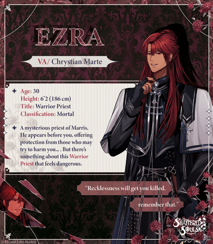 EZRA (CV: Chrystian Marte) – The priest love interest! Oh, forgive me father, for I have sinned! (with you lol) Another one of the LIs that I can’t really read into. He definitely seems to know a lot. He was the only one besides Shiro who knows what Marris looks like. Is he a devoted follower of the god? Beats me! His weapon of choice was a chain whip! HOT!