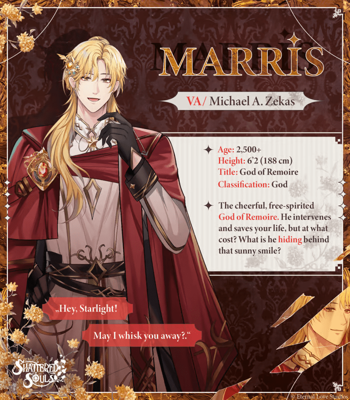 MARRIS (CV: Michael A. Zekas) – The first LI you’ll meet. Very nonchalant, happy-go-lucky. He’s apparently the god that saved your life. Not sure what his motive is? My first impression of him was “damn he’s blonde… and handsome!” 😂 From the demo, he definitely became one of my favs out of the all the boys. Gotta love a nonchalant sexy god, who plays matchmaker but is also actually your match? (though the story doesnt say this officially yet, its pretty obvious judging from him being one of the LIs!)😂 He also exudes himbo energy though there is definitely more to him than meets the eye!