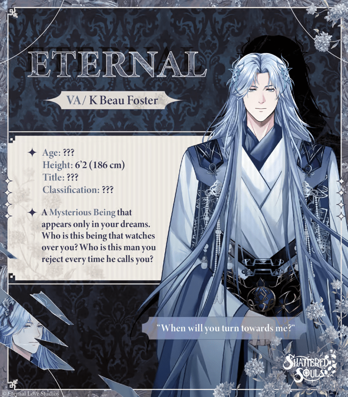 THE ETERNAL (CV: K. Beau Foster) – Damn, hot ethereal daddy alert! HE IS DEFINITELY THE ONE!😮💨😮💨😮💨 He also became one of my favs during the demo just from *that one scene alone*! And his voice is soooo deep and smooth like hot chocolate! OML!🫠 He reminded me of the male lead, Yuchi from Miss the Dragon… lol but maybe I’m reading too much into this and getting way ahead of myself!🤣 (cackles) He barely made appearances in the demo, but he definitely is one character to remember!