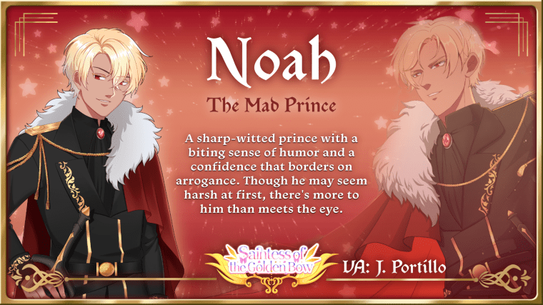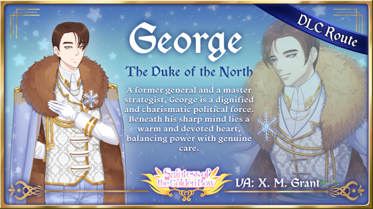 Saintess of the Golden Bow currently has a demo available to play on Steam which features its full common route. The demo is around four hours of gameplay, and includes multiple choices, a branching narrative with three handsome love interests (3M), 11 beautifully-colored CGs, character sprites for the entire cast, and partial voice acting.