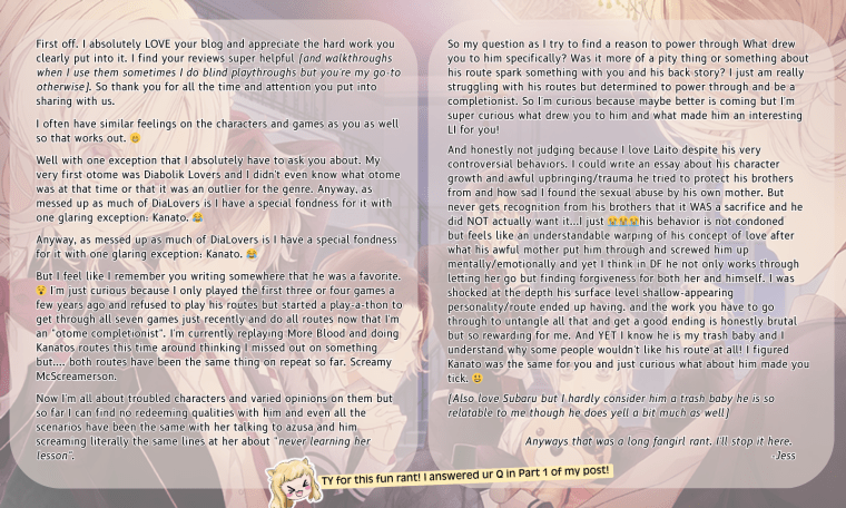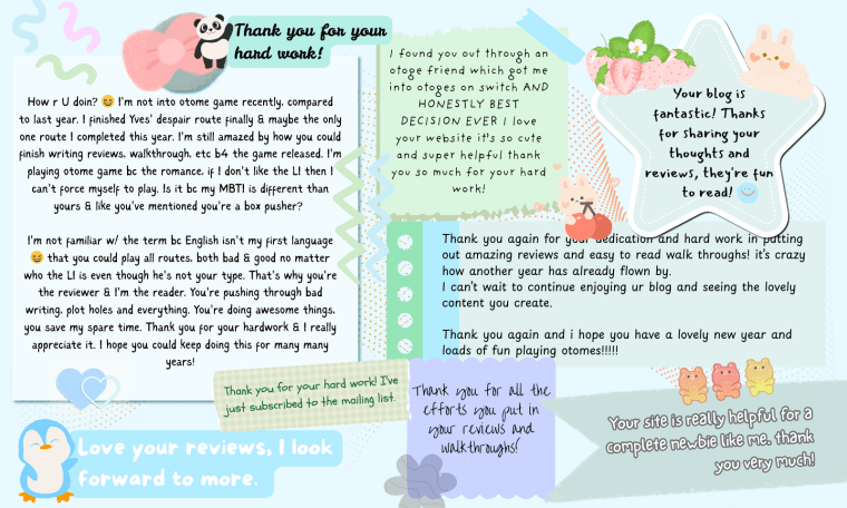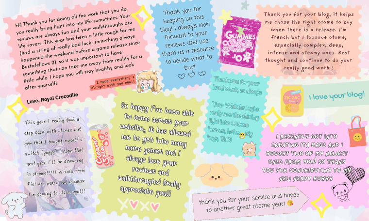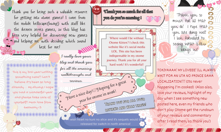 I’m super shy and not the type to comment much but I just wanted to say I absolutely love this blog. It’s so exciting the otome community has so many games coming out now but yikes my wallet can only handle so much 😆 your blog has helped me narrow down my purchases a lot and I’m always excited when you update. Hope the New Year is wonderful for you dear!