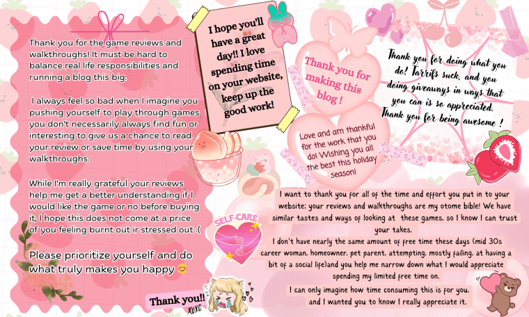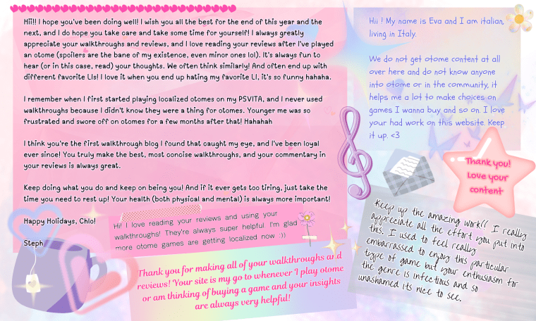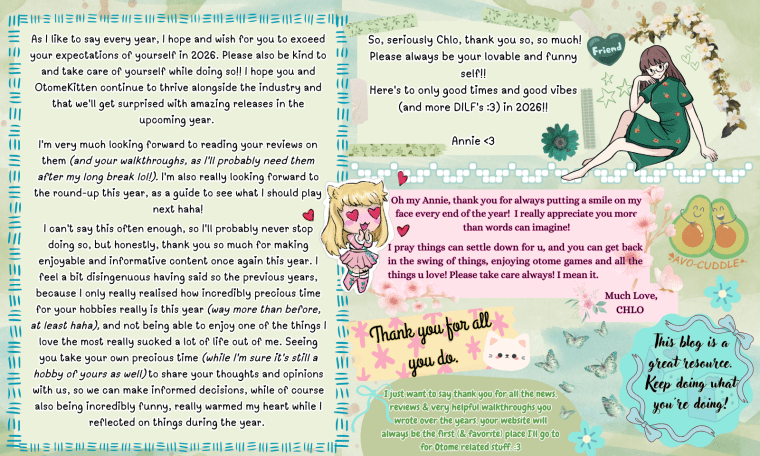 I am really really, incredibly grateful to everyone who still visits this site after all these years, leaves comments, fangirls with me, or even to those who point out walkthrough errors, spelling mistakes, typos, or to the ones who sends me news tips and game updates via email. You are all my comrades at heart. THANK YOU SO MUCH for treating me with such kindness this year. 🙇🏻♀️ I promise to return it twice as much through the content I create next year!!