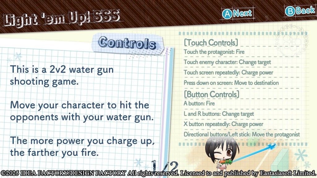 This is a pretty straightforward water gun shooting game. The goal is to keep shooting your opponent until their life bar is depleted to 0, or to have more life remaining than them when the timer runs out. You can use either touch controls or button controls for this mini game.