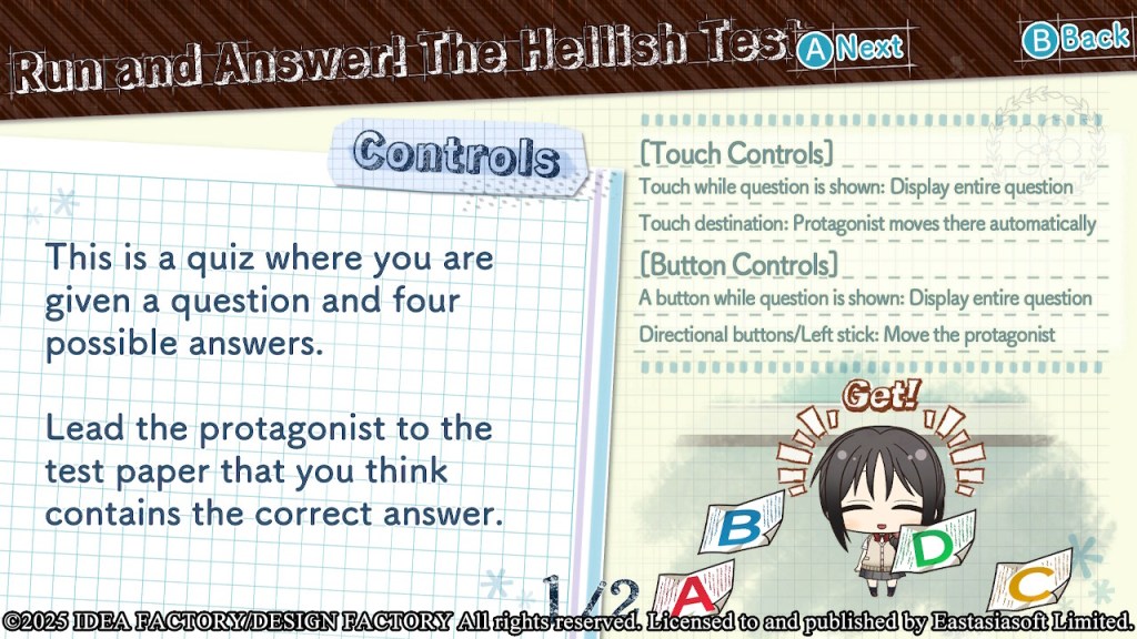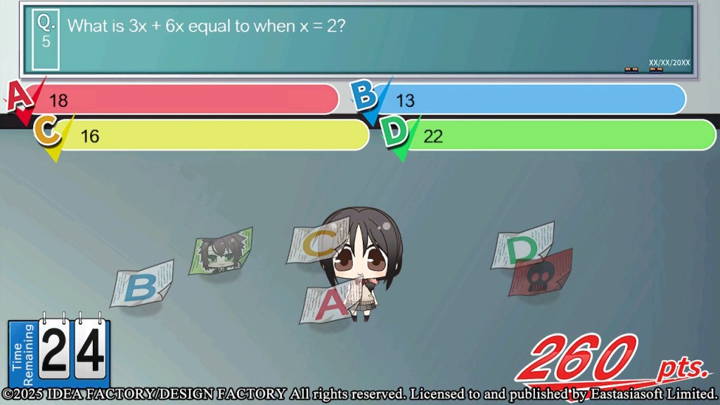 The tricky part is that some of the test papers can be very close together, so be sure to create enough distance when moving Chizuru from one paper to another to avoid landing on the wrong answer.