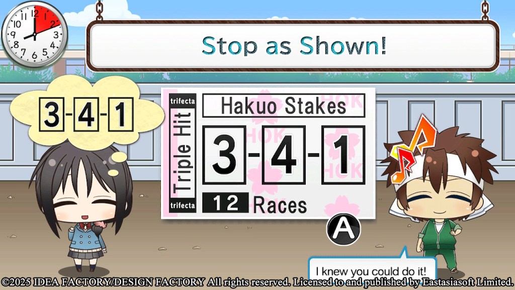 This mini-game requires careful timing. You must match the numbers on the Hakuo Stakes slip to the one shown above Chizuru’s head.