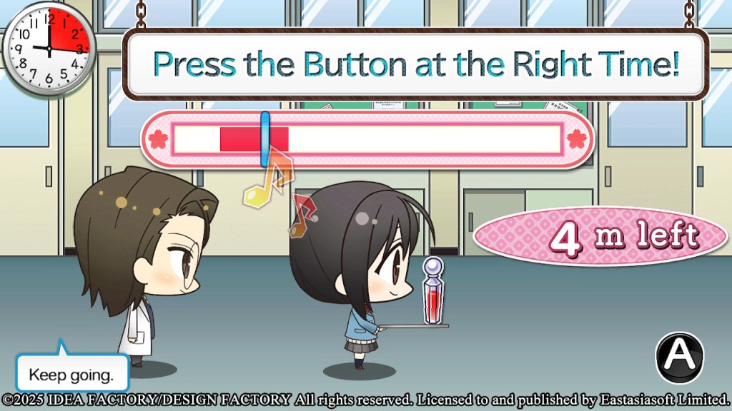 In this mini-game, you must press A when the the moving bar gets to the red highlighted area. You need to do this accurately 10 times before the timer runs out. The key here is to take your time, as the cursor loops, giving you plenty of chances to stop it precisely on the designated area.